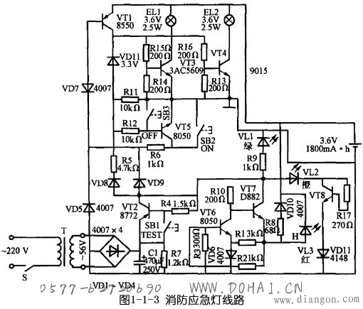 消防应急灯线路如图1-1-3所示。该线路被广泛安装于公共场所的走廊、消防通道内,属于消防专用设备。其工作原理如下。